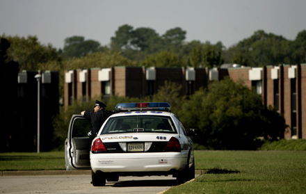 | Police patrol Virginia Wesleyan College on Thursday morning. The body of security officer Walter Zakrzewski was discovered late Wednesday near the student dining hall. In the background is student housing.